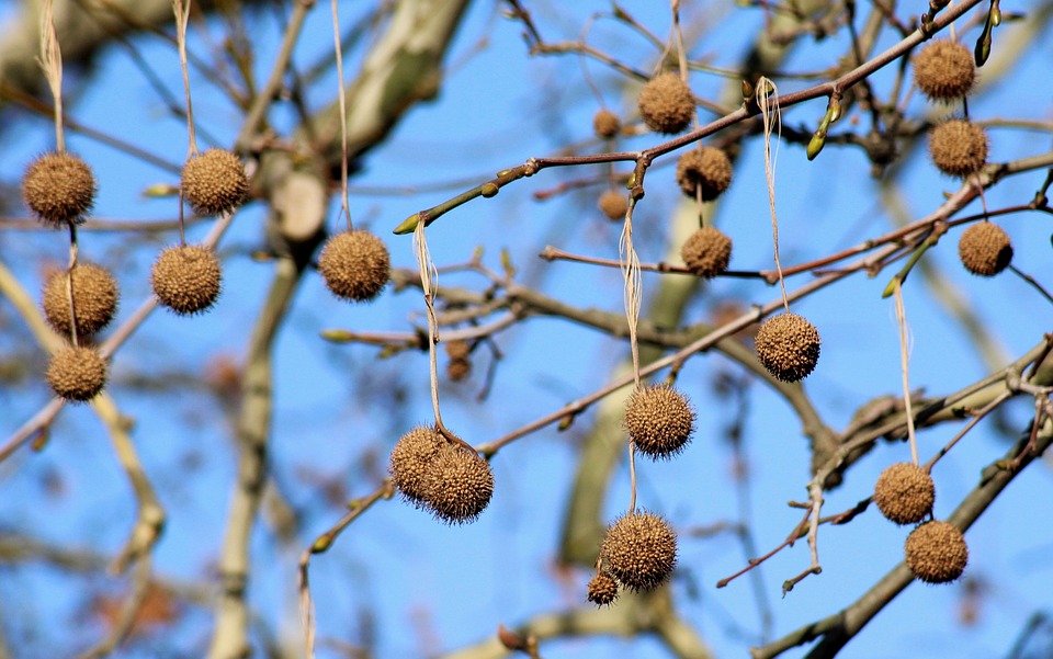 Ce sont des FRUITS DU PLATANE, regroupés en boules (ou glomérules) d’un diamètre de 2 à 5 cm. Ces glomérules persistent longtemps après la chute des feuilles.