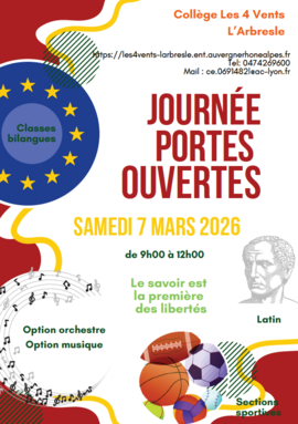 Le collège vous ouvre ses portes le samedi 7 mars, de 9h à 12h. Venez visiter les locaux, rencontrer les équipes et les élèves et découvrir les projets du collège.